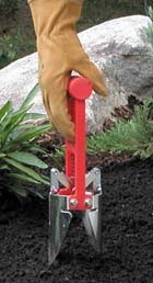 Planting bulbs and flowers has never been quicker. This tool is specially designed to dig holes effortlessly in one easy motion. Simply insert the Dirt Snatcher into your planting bed soil, pull the spring loaded side up to lift out the dirt. Now you have a perfect hole for planting bulbs or nursery plants, the quick release works great to fill dirt in when your planting is done. Constructed of nickel coated steel and high impact plastic. 1151 long x 3.551 wide, makes a 351 diameter hole.